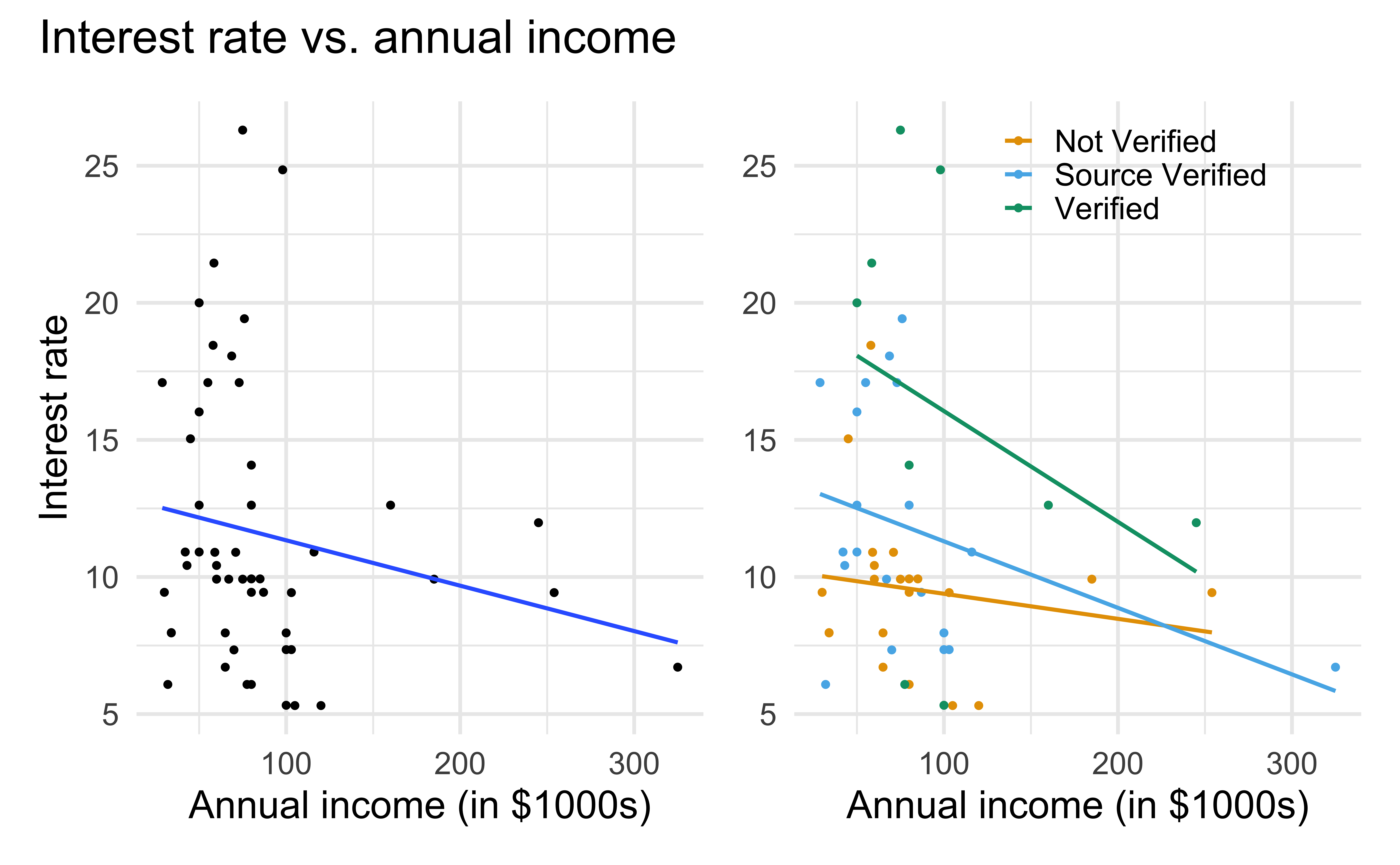 annual_income for source verified: If the income is source verified, we expect the interest rate to decrease by 0.023% (-0.007 + -0.016) for each additional thousand dollars in annual income, holding all else constant.Defining the interaction variable in the model formula as verified_income * annual_income_th_cent is an implicit data manipulation step as well