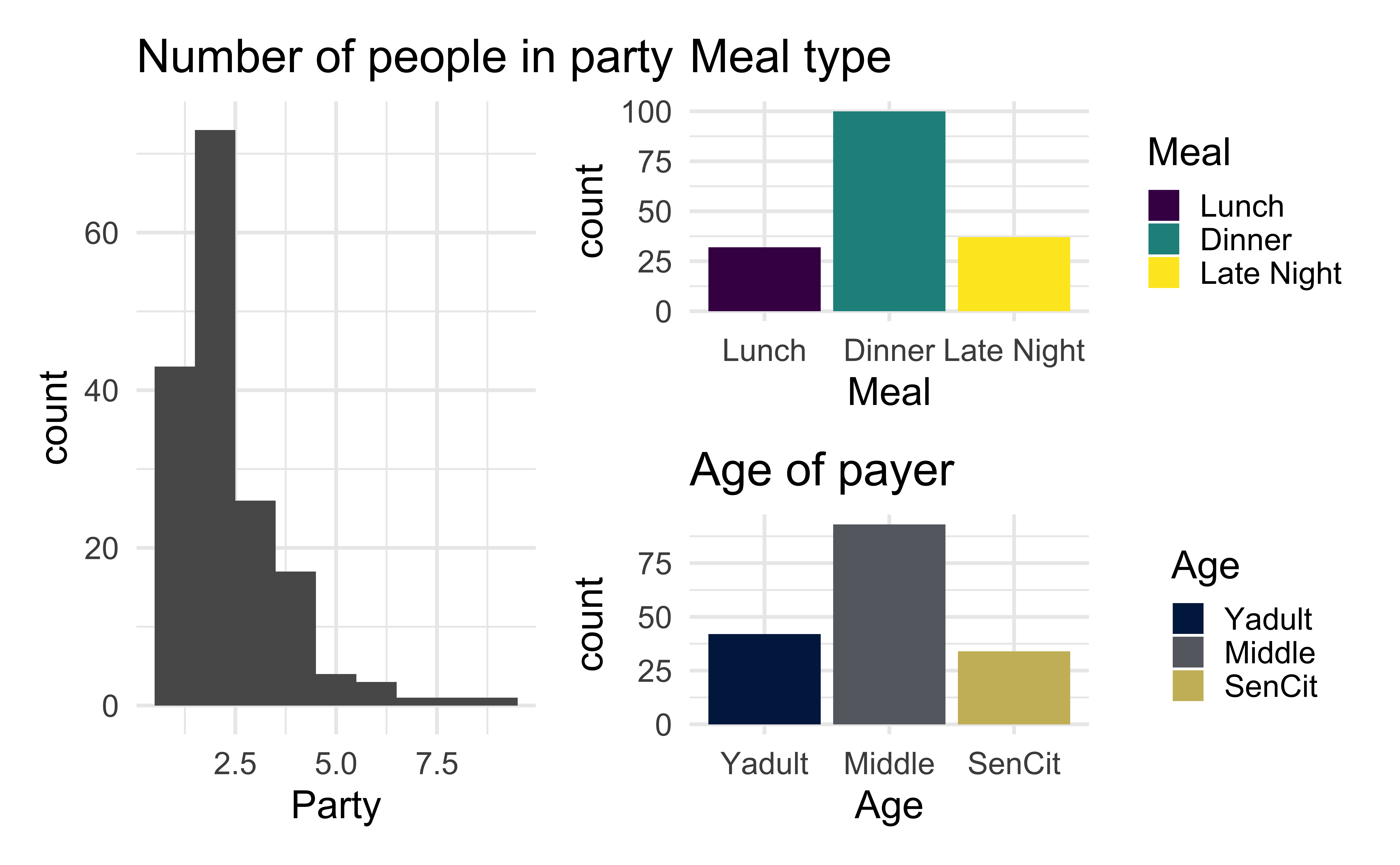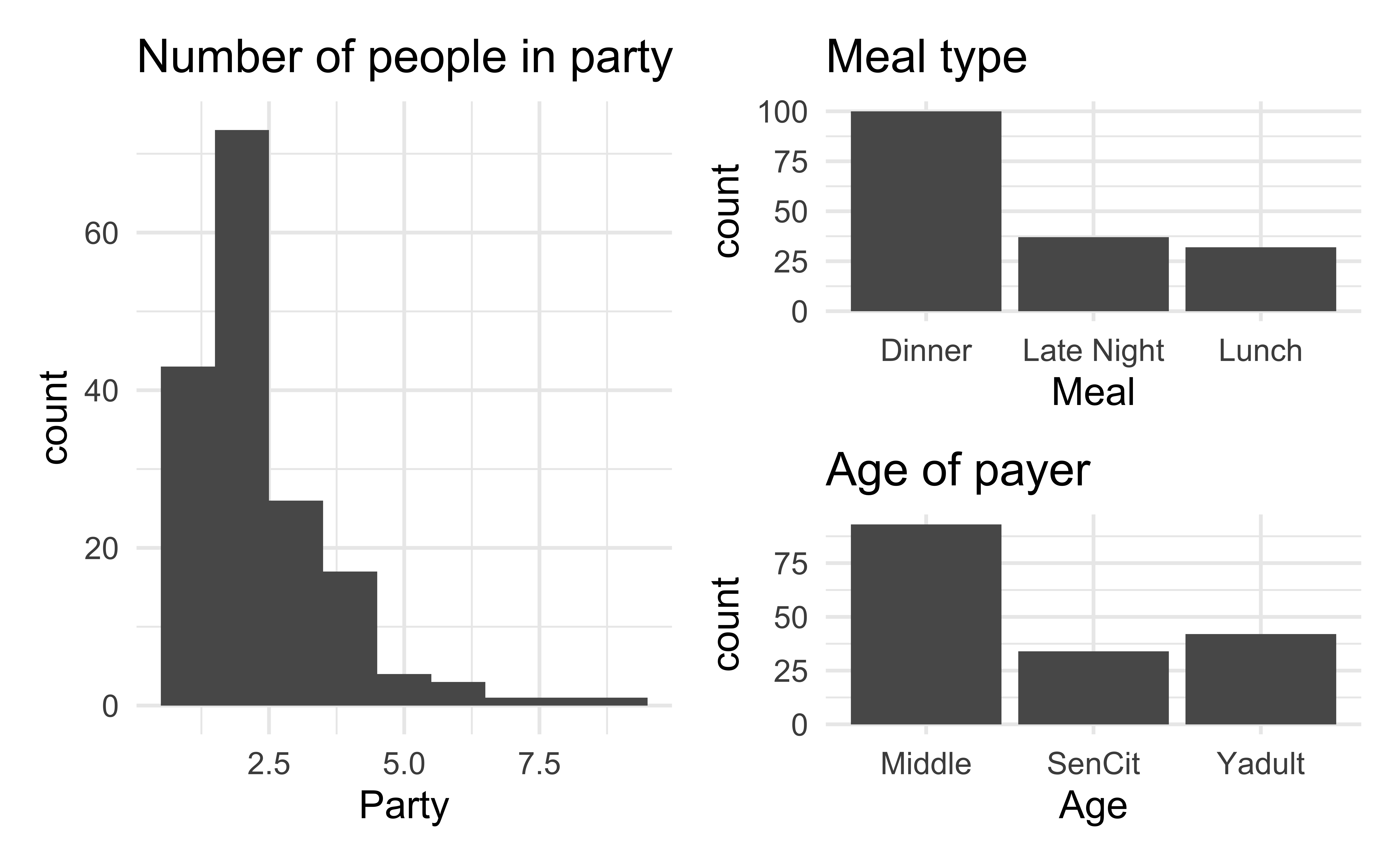 Party: Number of people in the partyMeal: Time of day (Lunch, Dinner, Late Night)Age: Age category of person paying the bill (Yadult, Middle, SenCit)Outcome: Tip: Amount of tip