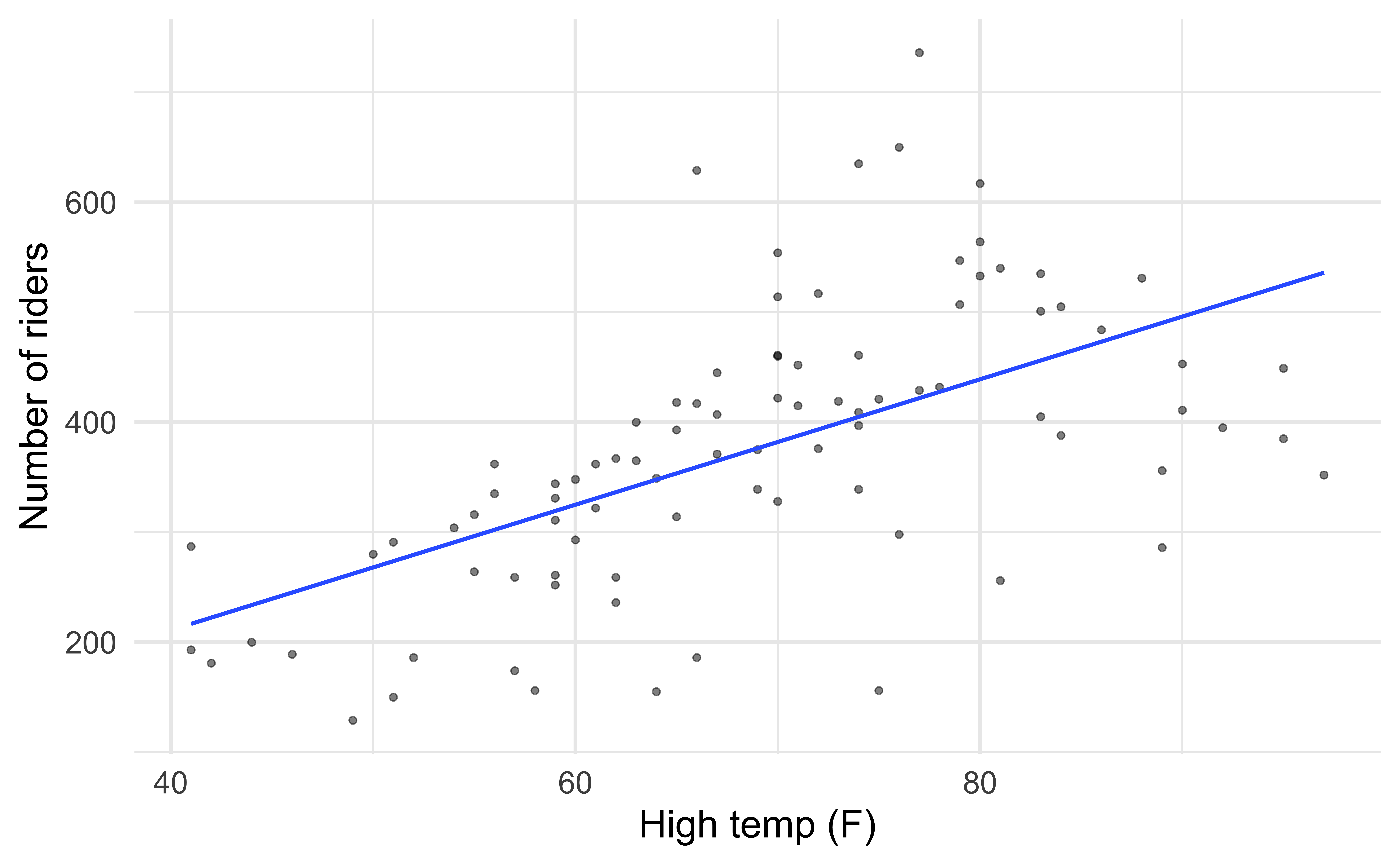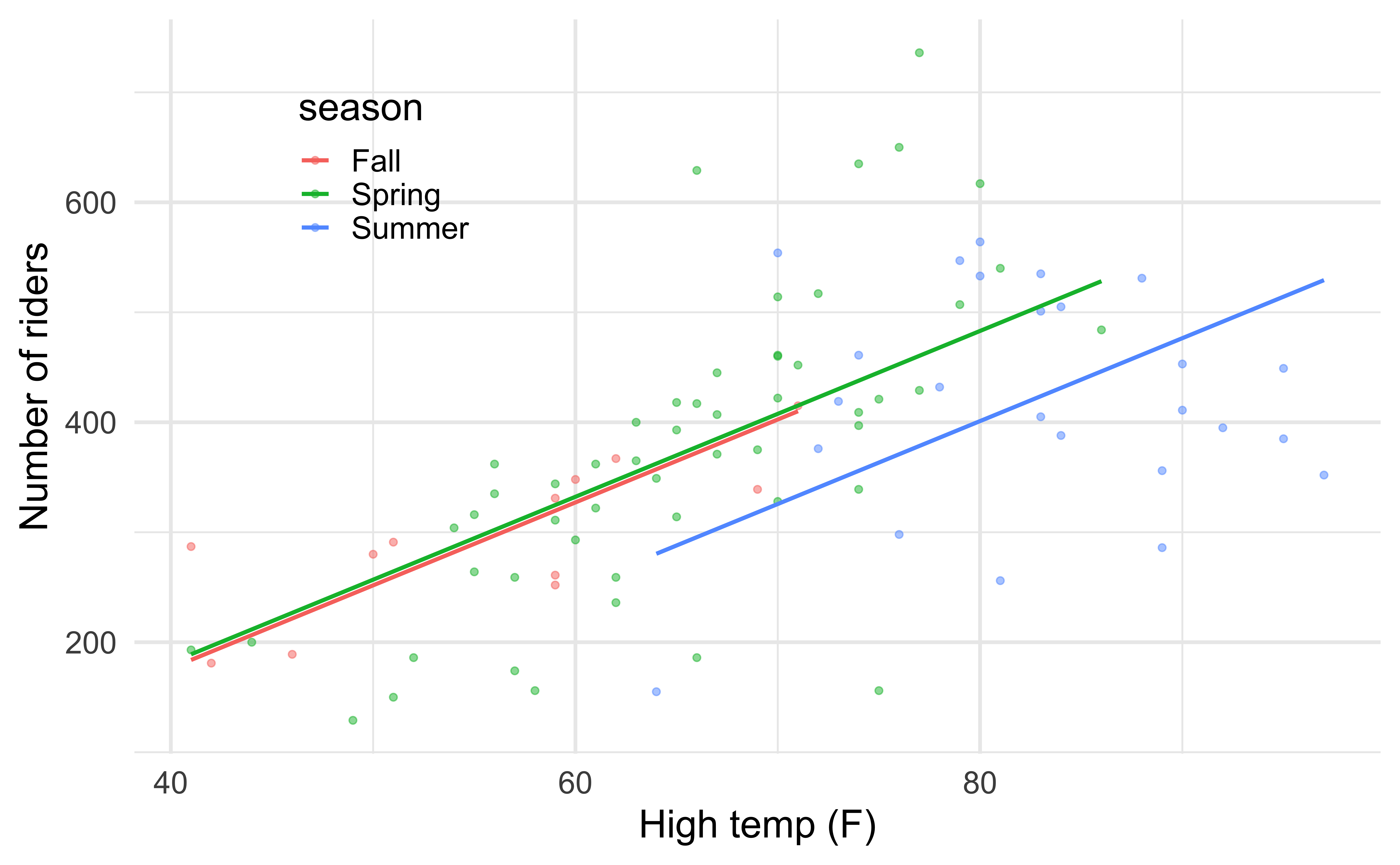 season = Spring: \(-120.10 + 7.54 \times \texttt{hightemp}\)season = Summer: \(-202.07 + 7.54 \times \texttt{hightemp}\)season = Fall: \(-125.23 + 7.54 \times \texttt{hightemp}\)Ex 1. Recreate the following visualization in R based on the results of the model.