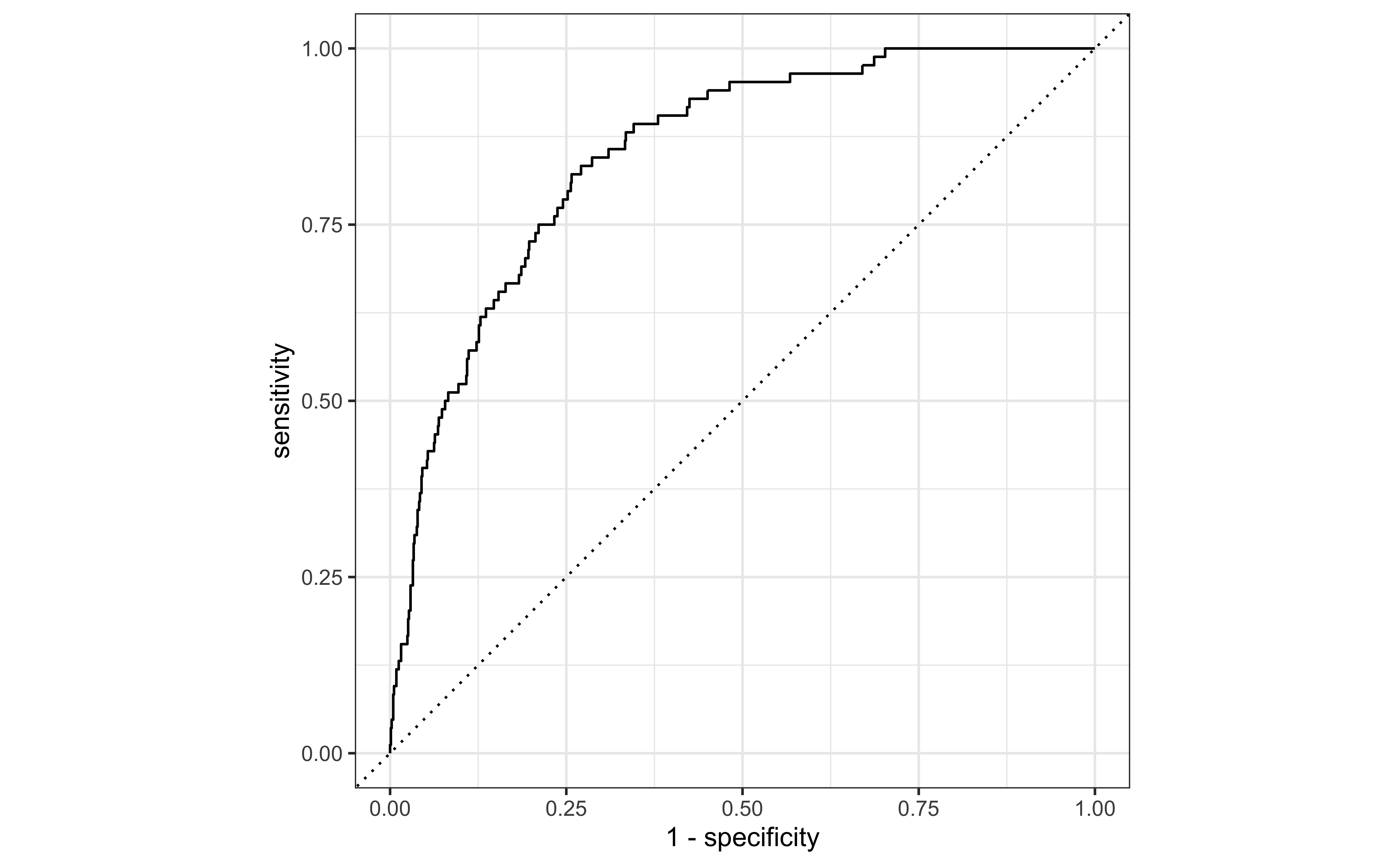 Receiver operating characteristic (ROC) curve+ which plot true positive rate vs. false positive rate (1 - specificity).