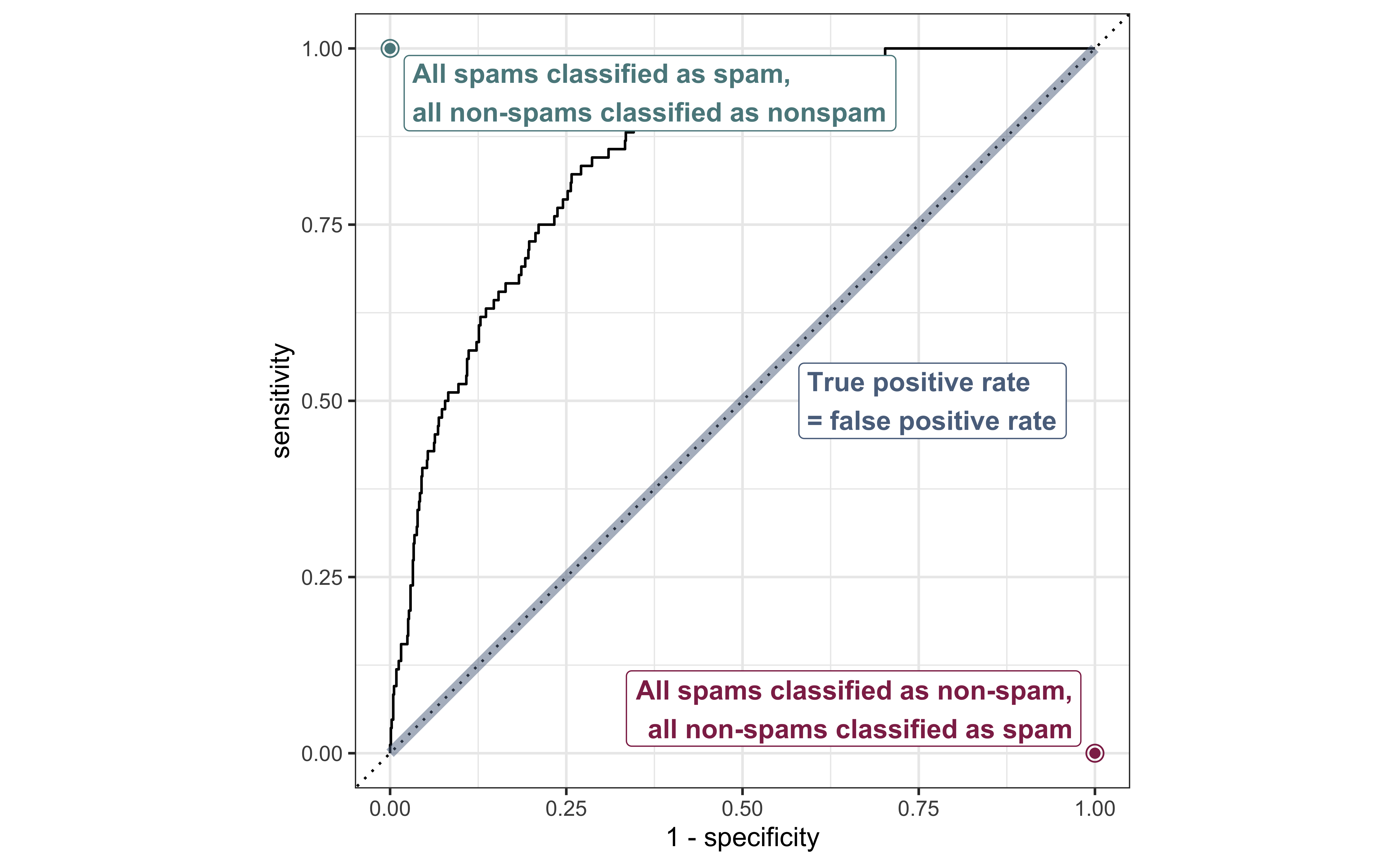 kable(col.names = c("", "Email is not spam", "Email is spam"))Suppose we decide to label an email as spam if the model predicts the probability of spam to be more than 0.75.