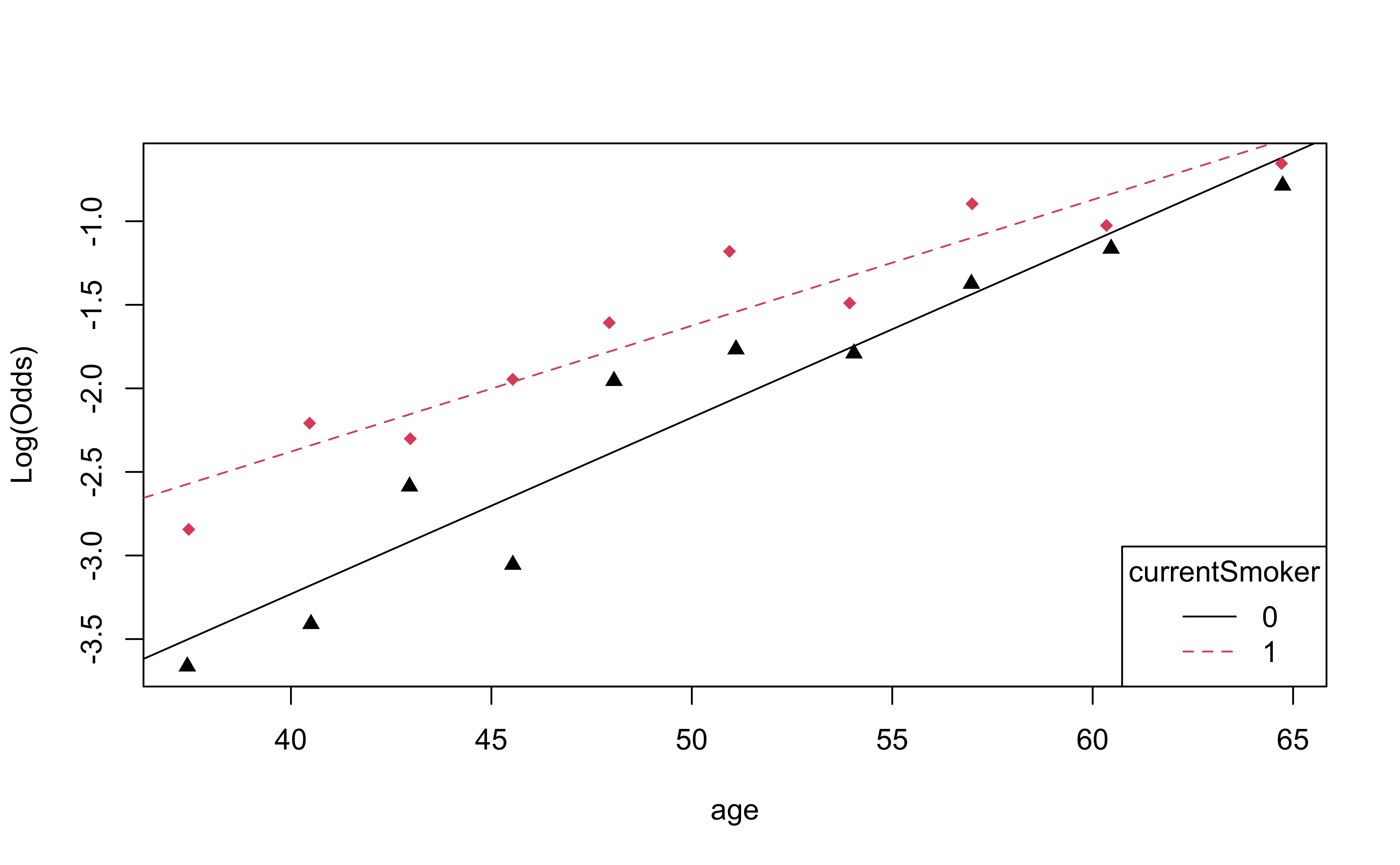\[ \small{\log\Big(\frac{\hat{\pi}}{1-\hat{\pi}}\Big) = -5.385 + 0.073 ~ \text{age} - 0.242 ~ \text{ed2} - 0.235 ~ \text{ed3} - 0.020 ~ \text{ed4}} \]