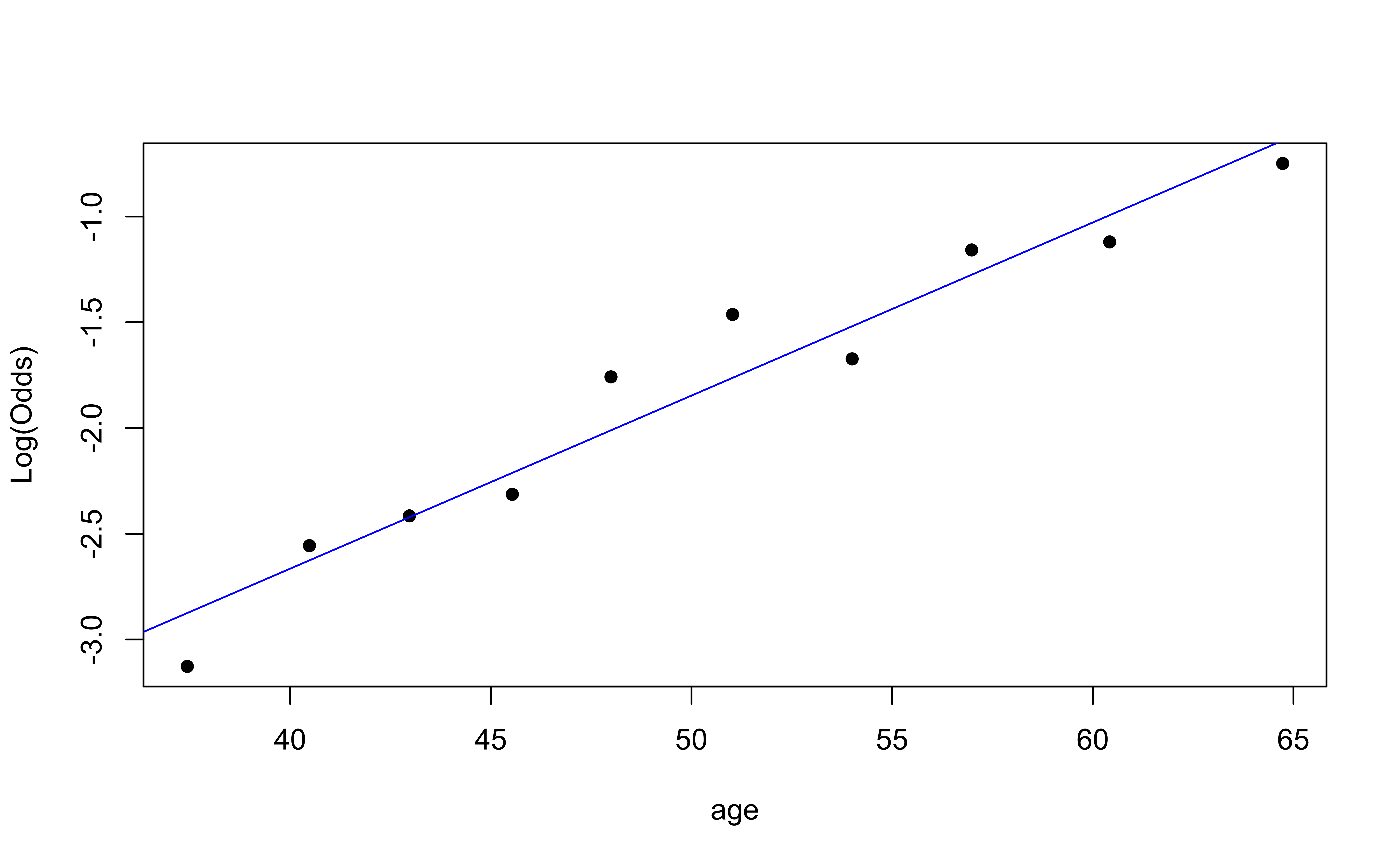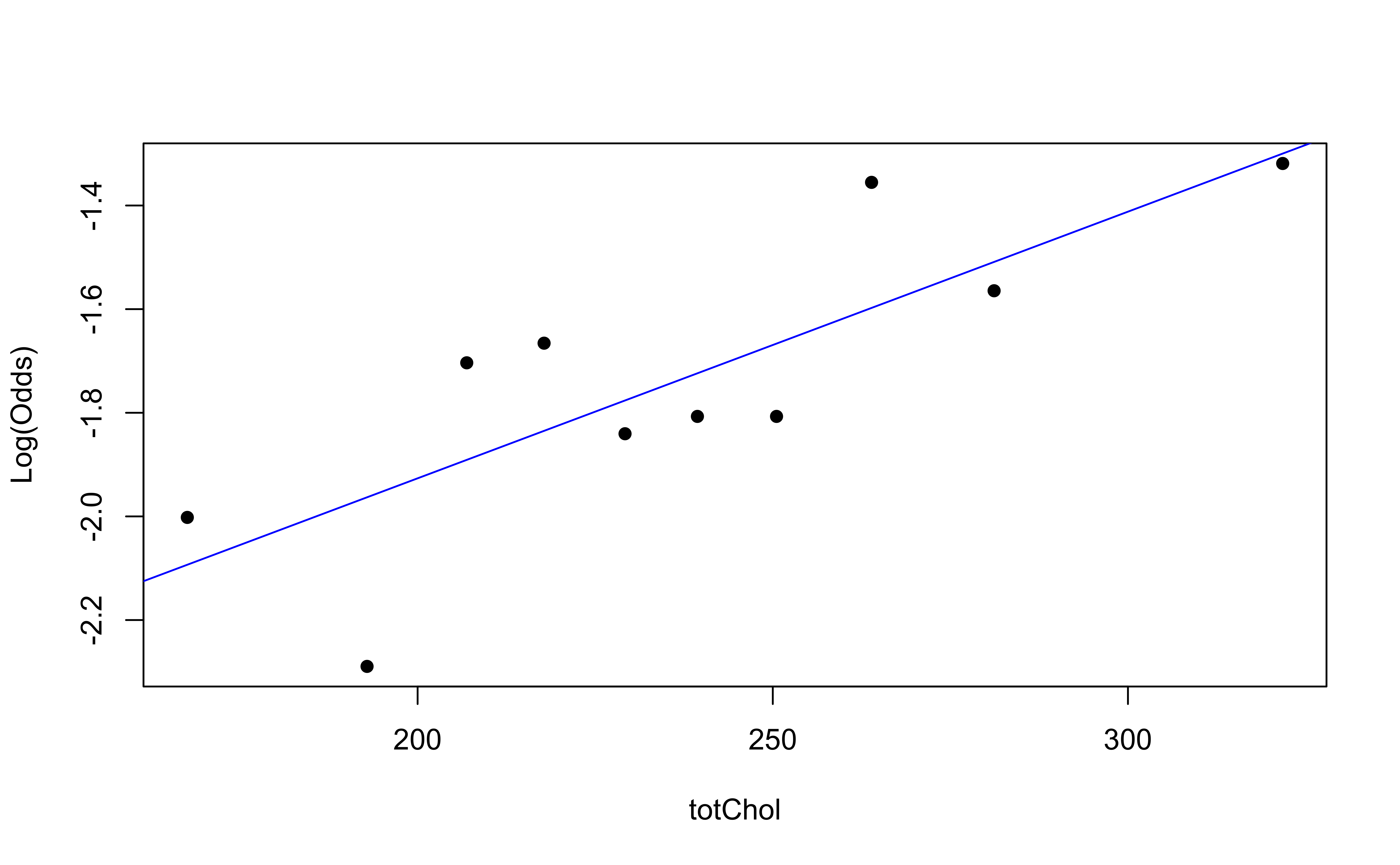 Then, create a plot of the empirical logit versus the mean value of the predictor in each interval.